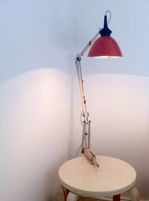 The design features an arm made from an extendible wooden ruler making it adjustable, in combination with already existing lighting components. Created as one of kind for the exhibition Poetry Happens it attempts to turn common into uncommon.