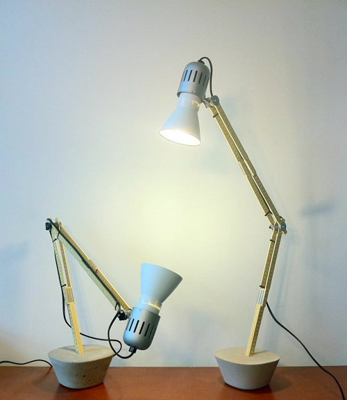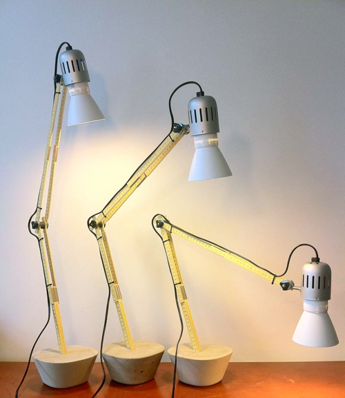 Technical Specifications: Beech wood ruler, concrete base, cable with switch and plug. Horizontal arm can be raised or lowered with 160° radius of travel. Lamp head swivellable through 180° and rotates by 350°. Complete with bulb. 230V - 14W energy-saving bulb